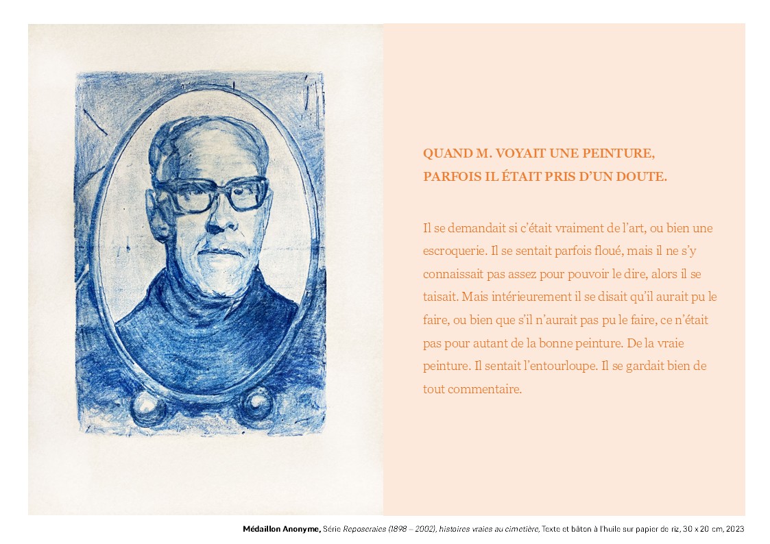 Le point commun de tous les portraits peints n’est ni le medium, ni le support, ni le format, mais la provenance : ils sont issus de médaillons de cimetière, s’étalant de la fin du XIXe siècle, jusqu’au début des années 2000, en France et à l’étranger.