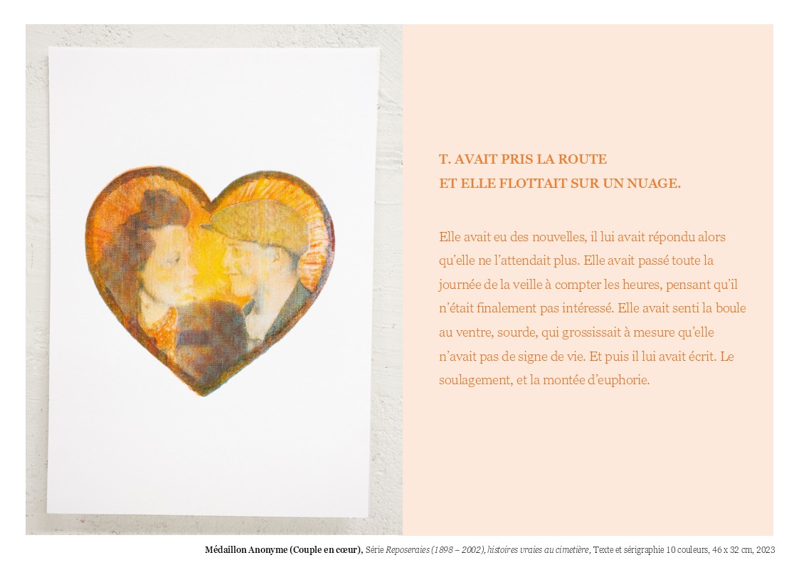 A la manière d’une auto-fiction, les Reposeraies sont un recueil de récits, imaginés ou vécus, auxquels j’associe des portraits d’anonymes, peints ou imprimés. La scansion texte-image se consolide en une mosaïque des pensées de l’ordinaire.